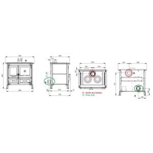 La porta con vetro ceramico resistente fino a 750°C garantisce sicurezza e una splendida vista della fiamma. Il focolare è rivestito in ghisa e vermiculite, assicurando ottima inerzia termica e prestazioni elevate. Il forno è fornito con griglia inclusa e l’evacuazione dei fumi può avvenire superiormente o posteriormente (Ø150 mm).