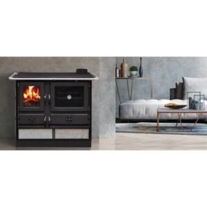 Il modello è dotato di piastra e cerchi in ghisa, griglia del focolare in ghisa, focolare in thermo-béton, termometro e regolazione dell’aria primaria e secondaria, che assicurano un controllo preciso della combustione e il massimo rendimento. Il cassetto porta-legna facilita lo stoccaggio, mentre la teglia forno inclusa consente di cucinare in modo pratico e versatile.